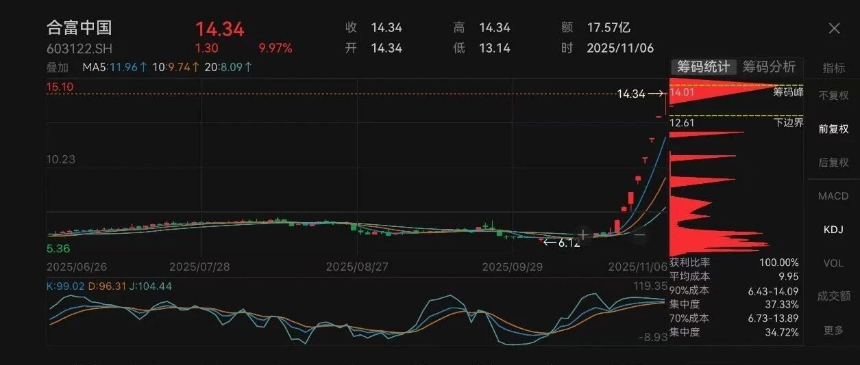 11月6日晚间,合富中国发布股票交易严重异常波动暨风险提示公告称,自2025年10月28日至2025年11月6日,公司股票连续八个 交易日以涨停价收盘,并连续3次触及股价异动,期间累计涨幅达99.7%。 公告提示,公司主营业务未发生重大变化,股价短期内连续上涨,存在市场情绪过热、非理性炒作风险,已明显高于同期行业及上证 指数涨幅,且严重显著偏离公司基本面,随时存在快速下跌风险。公司股票11月6日换手率突增至31.5%,股票交易显著放量,击鼓 传花效应明显。 11月6日, 合富中国盘中再度涨停,走出8连板,截至收盘,该股报14.34元/股。 合富中国近几个交易日已连续发布公告提示风 险。 编辑|钉钉 ...