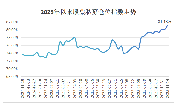股票私募仓位指数再攀高峰。 私募排排网数据显示,截至2025年11月14日,股票私募仓位指数达81.13%,较前一周大幅提升1.05%, 不仅实现连续3周站稳80%关口、刷新年内新高,更创下近112周以来的峰值。 从仓位结构来看,中等仓位私募的集中加仓成为本次指数突破的核心动力。数据显示,满仓股票私募占 比已提升至65.9%,中等仓位私募占比则降至18.97%,低仓、空仓私募占比分别为10.37%和4.76%。不 难看出,中等仓位私募向满仓水平集中提升,成为此次仓位指数突破的关键动力。 | | | | 不同规模股票私募近一月仓位指数统计 | | | | | --- | --- | --- | --- | --- | --- | --- | | 日期 | | | 100 亿以上 50-100 亿 20-50 亿 10-20 亿 5-10 亿 0-5 亿 | | | | | 2025-11-14 | 87.07% | 83.56% | 78. 67% | 80. 48% | 80. 86% | 80. 09% | | 2025-11-07 | 79. 09% | 85. 18% | 79.07% | 80. 87 ...
