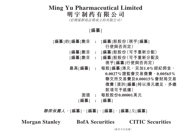 据港交所11月24日披露,明宇制药有限公司(简称:明宇制药)递表港交所主板,Morgan Stanley、BofA Securities、CITIC Securities为其联席保荐人。招股书显示,明宇制药于2018年成立,是一家生物技术创 新企业。公司具有双重增长引擎:基于专有抗体偶联药物(ADC)平台及一款新型PD-1/VEGF双特异性抗 体(bsAb)搭建的稳健的临床阶段肿瘤产品组合,以及向商业化推进的已处于临床后期的自身的免疫资 产。 截至2025年11月16日,公司的管线有13款候选产品,其中10款处于临床阶段。公司的自身免疫项目有望 于近期产生收入,肿瘤项目聚焦于推动用于后线治疗的ADC单药疗法,并探索与PD-1/VEGF双特异性 抗体的联合疗法,以革新一线癌症治疗。 | [編纂]的[編纂]數目 | : [编纂]股股份(視乎[編纂] | | --- | --- | | | 行使與否而定) | | [編纂]數目 .. | [编纂]股股份(可予童新分配) | | [編纂]數目 | :〔编纂]股股份(可予直新分配及 | | | 視乎[編纂]行使與否而定) | | 最高[編纂] : | 蚕股[編纂]港元, ...