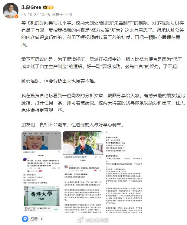 【#格力朱磊回应翻车#】珠海格力电器股份有限公司市场总监@朱磊Gree 发文称:等飞机的时间再写 几个字。这两天到处能刷到"朱磊翻车"的视频,好多视频号讲得有鼻子有眼,反指我揭露的内容是"格 力友军"所为?这太有意思了。得承认脏公关的内容做得蛮巧妙的,利用了短视频时代看五秒的特质, 再把一颗脏心眼埋在里面。 ...