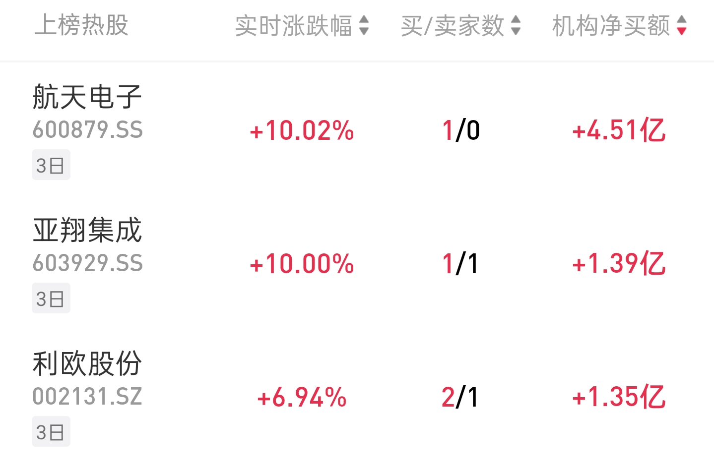 龙虎榜机构热股 今天机构龙虎榜上榜34只个股,净买入18只,净卖出16只。当日机构买入最多的个股前三位是:航天电子(4.51亿)、亚翔集成(1.39亿)、利欧股份 (1.35亿)。 航天电子 龙虎榜显示,今日1家机构净买入4.51亿。 龙虎榜知名游资 一、脑科学 三博脑科 | 上榜热股 | 实时涨跌幅♀ 买/卖家数♦ | | | --- | --- | --- | | 航天电子 600879.SS | +10.02% | 1/0 | | 3日 | | | | 亚翔集成 603929.SS | +10.00% | 1/1 | | 이크 | | | 个股龙虎榜 | 利欧版份 | | --- | | 002131.SZ | 公司是以神经专科为特色的医疗服务集团,目前共运营了6家医院,其中神经专科医院4家,综合性医院2家 道氏技术 个股龙虎榜 公司控股子公司香港佳纳以3000万美金认购强脑科技Pre-B轮优先股 平安证券认为,Neuralink今年将对脑机接口设备开启"大规模量产",手术流程转向高度精简、几乎完全自动化,线体插入时间缩短至1.5秒,针筒的制造成 本更是降低了95%。其中最关键的突破在于,设备的电极丝将 ...