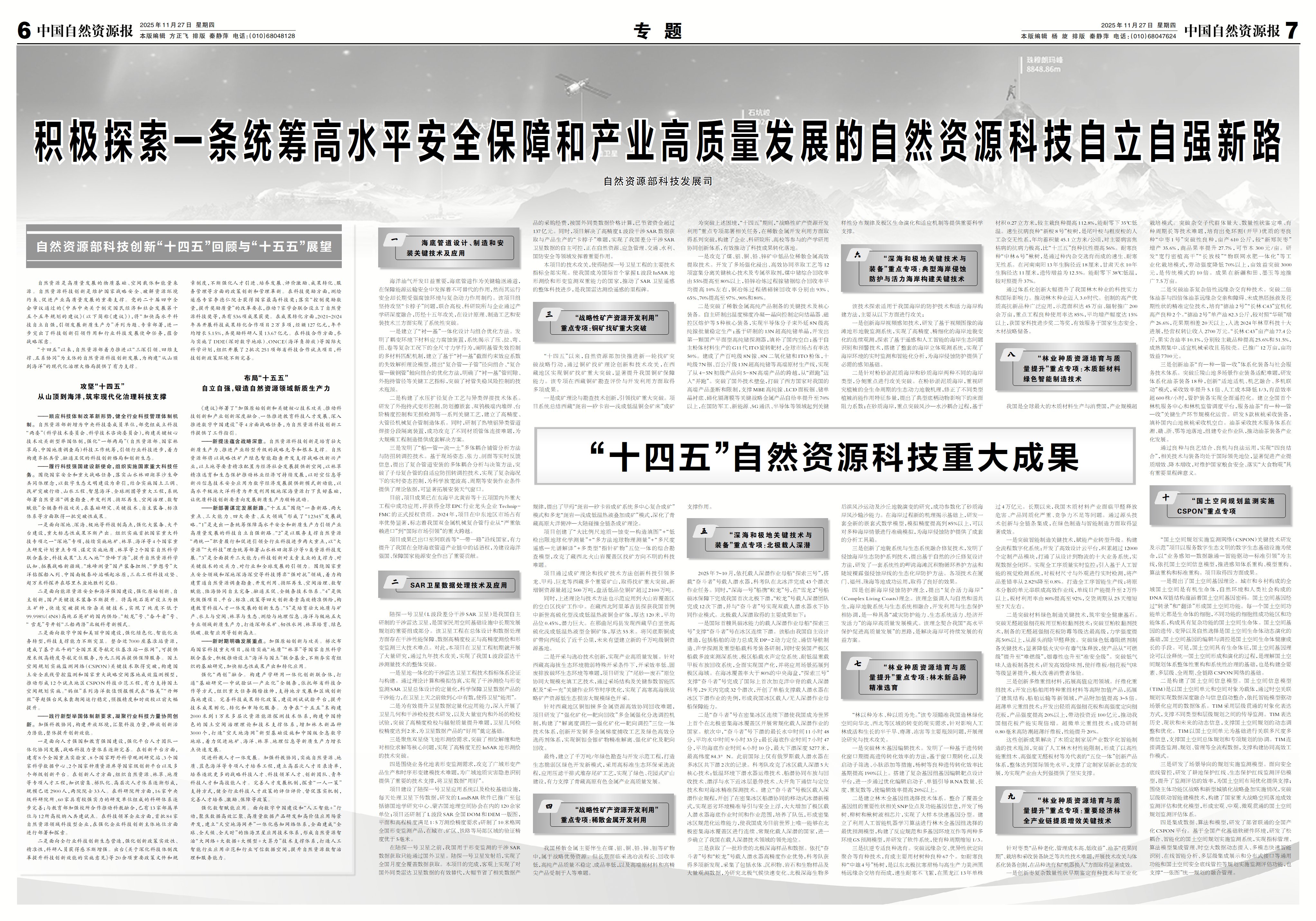 一是面向深地、深海、极地等科技制高点,强化大装备、大平台建设,重大标志性成果不断产出。组织实施首批国家重大科技专项之一"深地"专项,接 续实施地矿、林草、海洋等4个国家重点研发计划重点专项、谋定实施地质、林草等2个国家自然科学联合基金,科技成果"上天入地""登峰下海",提升自然 资源科学认知、拓展战略新疆域。"珠峰测量"国产装备担纲、"梦想号"大洋钻探船入列、中国南极秦岭站崛起冰原,三北工程科技攻坚、超万米科探井在塔 里木盆地胜利完钻。 二是面向能源资源安全和海洋强国建设,强化原始创新、自主创新,国产关键技术装备不断提升。将高纯石英矿设立为独立矿种,快速突破提纯除杂关 键技术,实现了纯度不低于99.998%(4N8)高纯石英矿的国内供给。"蛟龙"号、"奋斗者"号、" 雪龙"号开创"三船两潜"北极科考新模式。 三是面向数字中国和美丽中国建设,强化绿色化、智能化业务转型,科技支撑能力不断突显。整合近7000座基准站资源,建成了基于北斗的"全国卫星 导航定位基准站一张网",可提供厘米级高精度导航定位服务,为九三阅兵提供保障服务。国土空间规划实施监测网络(CSPON)关键技术取得突破,构建 国土安全底线管控监测和国家 ...