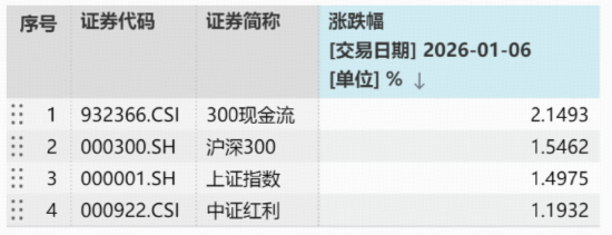 2026年1月6日,A股市场继续高歌猛进,现金流策略再度走强,300现金流指数收涨2.15%跑赢中证红 利、沪深300、上证指数等主要指数,慢牛格局中"现金为王"逻辑被再度验证! | | 序号 证券代码 证券简称 | 涨跌幅 | | | --- | --- | --- | --- | | | | [交易日期] 2026-01-06 [車位] % ↓ | | | | 1 932366.CSI 300现金流 | | 2.1493 | | :: | 2 000300.SH 沪深300 | | 1.5462 | | | 3 000001.SH 上证指数 | | 1.4975 | | | 4 000922.CSI 中证红利 | | 1.1932 | 数据来源:沪深交易所等,截至2026.1.6,指数历史涨跌幅不预示其未来表现 ETF方面,全市场规模最大,流动性最佳*的300现金流ETF(562080) 被动跟踪300现金流指数,一键 布局沪深300核心资产中的"现金奶牛",1月6日全天强势,收涨1.96%创历史新高,报收于0.625元,近1 年净值已累计创新高29次,展现出强劲的上行动能。 尤为引人注目的是,自其成立以 ...