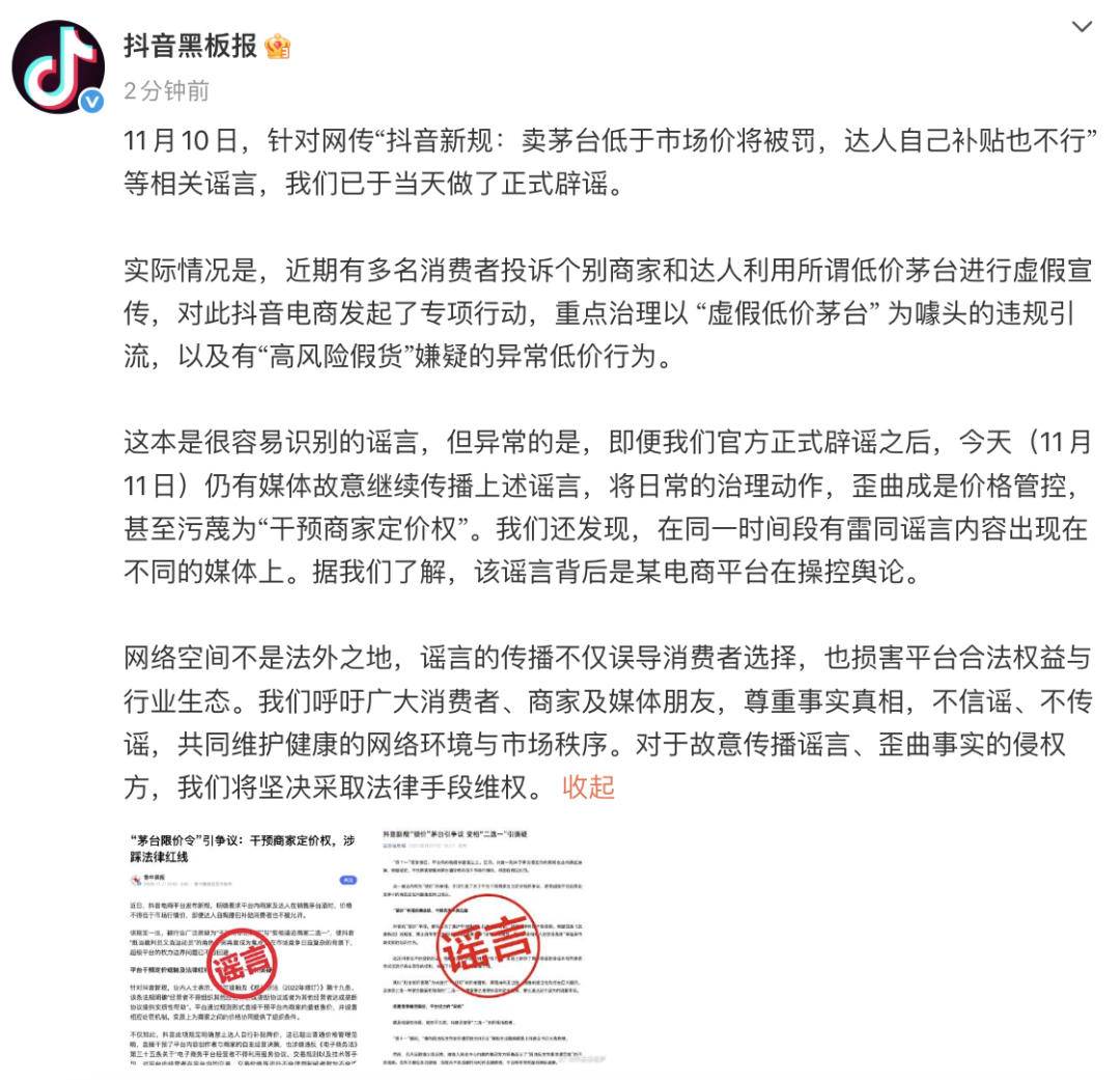 抖音辟谣“卖茅台低于市场价将被罚”相关谣言:背后是某电商平台在操控舆论