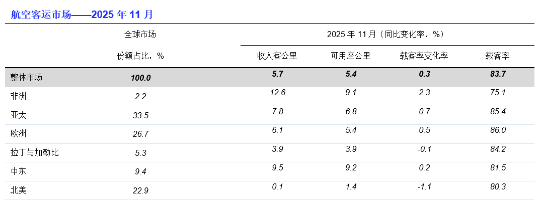 智通财经APP获悉,1月29日,国际航空运输协会(IATA,简称"国际航协")发布2025年11月全球航空客运市场数据。2025年11月全球航空客运总需求(按照 RPK,收入客公里计算)同比2024年11月增长5.7%。总运力(按照ASK,可用座公里计算)同比增长5.4%,11月载客率83.7%,同比增0.3个百分点,创历年11 月份新高。国际需求同比2024年11月增长7.7%。运力同比增长7.1%,载客率84.0%,同比增0.4个百分点。国内需求同比2024年11月增长2.7%。运力同比 增长2.7%。载客率83.2%,与去年同期持平。 国际航协理事长威利·沃尔什(WillieWalsh)表示:"2025年11月,全球航空出行需求保持强劲,同比增长5.7%。当月载客率升至83.7%,创历史新高。在供应 链持续承压、运力受限的背景下,航空公司仍在积极应对不断增长的旅客需求。进入新的一年,制造业必须将提升产能作为首要目标,以满足航空公司客 户的实际需要。2025年累计形成的逾1.7万架飞机订单积压,亟须在2026年得到有效缓解。" | | 全球市场 | | 2025年 11月(同比变化率,%) | | | | ...