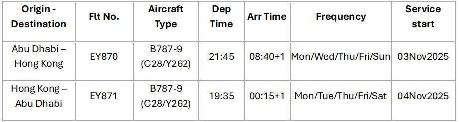 01 "刷到阿提哈德复航香港的消息直接冲了!2000出头直飞阿布扎比,比中转还便宜,机身上的土豪金饰条也太吸睛了!" 11月4日,"中东最低调的土豪航司" 阿提哈德航空 EY870 航班,身披鎏金光影稳稳降落在香港国际机场,宣告阿布扎比与香港中断许久的空中通道正式恢 复。 对出境游消费者来说,这不仅是一条航线的回归,更是高性价比跨国出行的新选择。 作为阿联酋国家航空公司,阿提哈德航空这次复航背后,是全球航空业回暖后,中东航企深耕中国市场的全新布局,也折射出大湾区出境游市场的强劲活 力。 为抢占市场份额,阿提哈德此次复航拿出十足诚意,从航班配置到票价都精准击中消费者需求: 航班每周运营五班,采用波音787-9梦想客机执飞,这是阿提哈德机队的主力机型,提供优质的商务舱专属座位与经济舱服务; | Origin - | Flt No. | Aircraft | Dep | Arr Time | Frequency | Service | | --- | --- | --- | --- | --- | --- | --- | | Destination | | Type | Time | | | start | | A ...