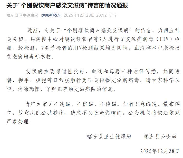 辽宁喀左县通报“个别餐饮商户感染艾滋病”传言:受检者HIV检测均阴性