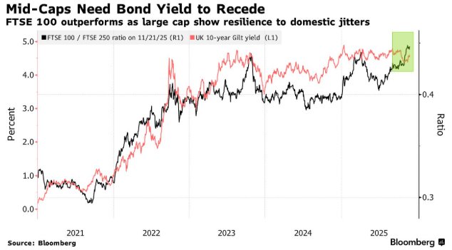 智通财经APP注意到,英国股票投资者正严阵以待,准备迎接该国多年来最受关注的预算案之一。财政 大臣雷切尔.里夫斯正寻求筹集约300亿英镑(390亿美元)以填补公共财政窟窿,重塑财政可信度。 预算案公布前,政府已出现多次政策逆转并陷入政治危机。里夫斯明显放弃提高所得税的计划令企业担 忧可能出现税种拼凑式加税。周三公布的预算案中,可能首当其冲的行业包括银行业、住宅建筑商、零 售商和商业地产商。 巴克莱分析师保罗.梅指出,市场普遍怀疑里夫斯能否实现收支平衡,这推高了投资者要求英国资产承 担的风险溢价。"在经营环境不明朗的情况下,很难对股票回报感到安心。" 投资者在研判预算案时,不仅要权衡针对特定行业的措施,还需考量影响整体消费者情绪的政策,例如 任何所得税起征点冻结范围的扩大。 以下是预算日值得关注的要点: 对利率和汇率敏感的股票 债券市场对预算案历来反应迅速激烈(前首相利兹.特拉斯可作证),很可能定下市场基调。收益率上升会 降低股票的相对吸引力,反之亦然。收益率对银行、保险、住宅建筑和商业地产等特定行业有更直接影 响。 City Index高级分析师菲奥娜.辛科塔表示:"任何市场不认同里夫斯计划的迹象都可能推高债 ...