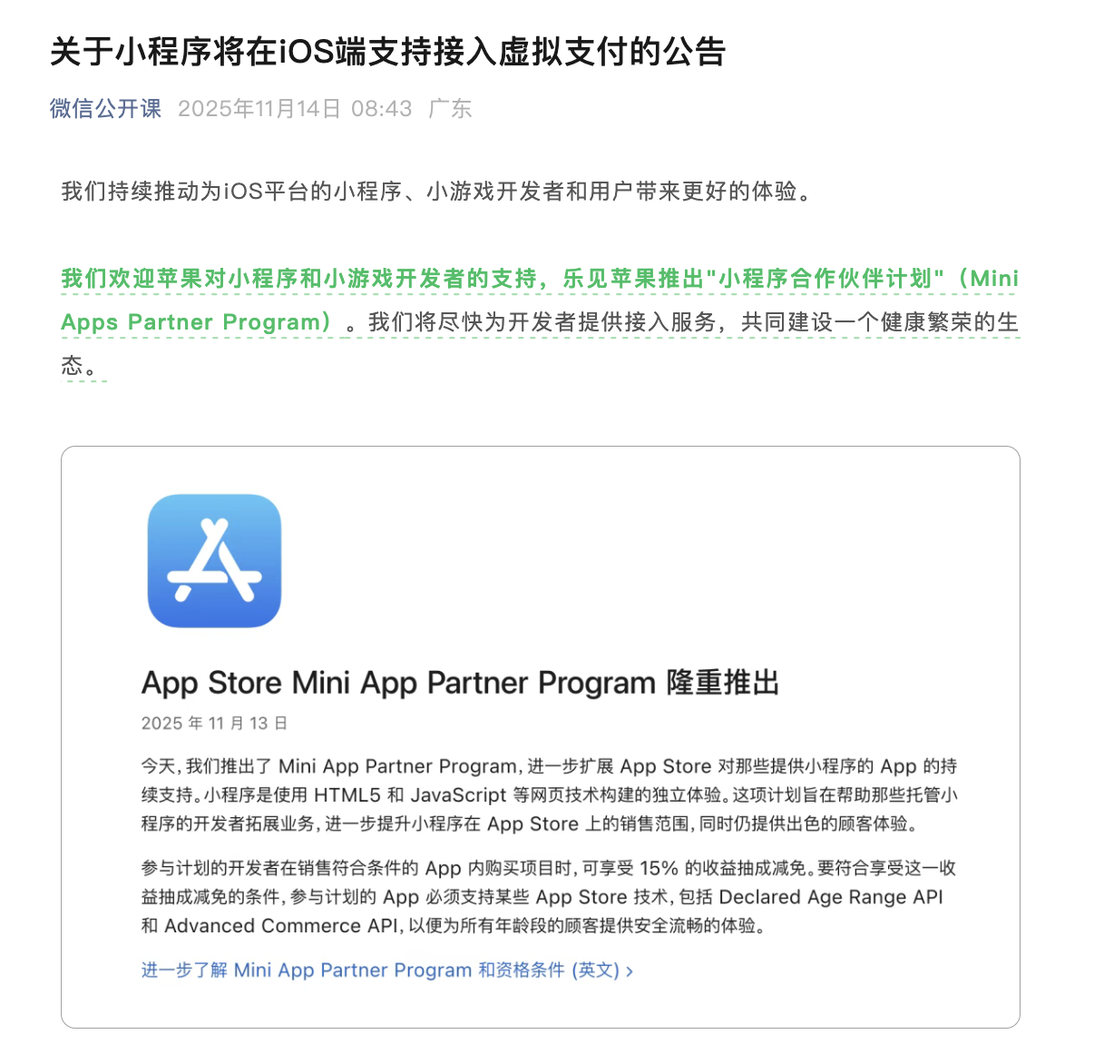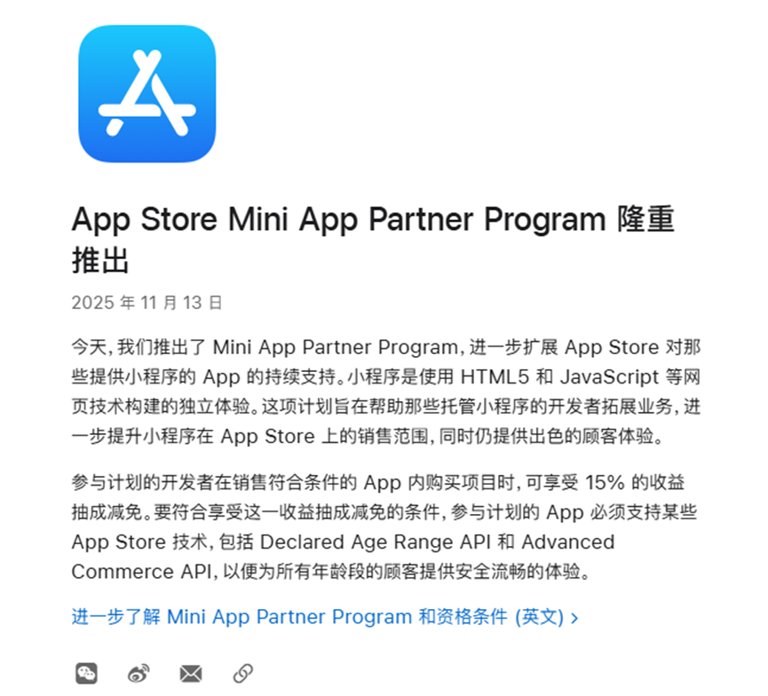 Core Insights - Apple has launched the "App Store Mini App Partner Program," allowing developers to enjoy a 15% commission reduction on eligible in-app purchases, resulting in an 85% revenue share [1] - Developers must meet two core conditions: their mini-programs must be built using web technologies like HTML5 and JavaScript, and they must support specific App Store technologies [1] - The program applies to all developers, regardless of size, enabling major platforms like WeChat, Alipay, and Douyin to benefit from the reduced commission rate [1] Industry Response - WeChat's official account welcomed Apple's initiative, expressing eagerness to provide developers with access services to build a healthy ecosystem [2] - Tencent's President Liu Chiping acknowledged the ongoing collaboration with Apple and expressed a constructive attitude towards the development of the mini-game ecosystem [5] Financial Context - Apple's service revenue reached $28.75 billion in Q4 FY2025, a 15.13% year-over-year increase, marking a historical high, with total service revenue for FY2025 surpassing $100 billion [6] - The ongoing debate around the "Apple Tax," which refers to the 30% commission Apple charges developers, has drawn global regulatory scrutiny [6][7] Regulatory Environment - In response to regulatory pressures, Apple has adjusted its payment policies in major markets, allowing U.S. consumers to use third-party payment options without incurring commissions [6] - Despite these adjustments, China remains under strict regulations, with users required to use Apple's App Store and IAP for digital purchases, leading to consumer complaints against Apple's market practices [7] - The "Mini App Partner Program" is seen as Apple's latest concession to regulatory pressures, aimed at expanding business opportunities for mini-program developers while maintaining customer experience [7]
