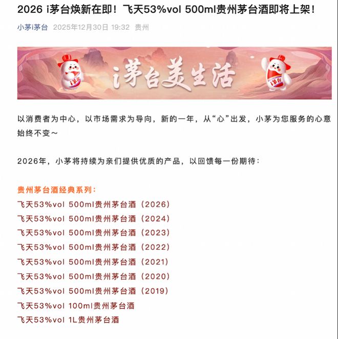 i茅台将正式上架飞天茅台。 12月30日晚,南都湾财社-酒水新消费指数课题组记者注意到,i茅台正式宣布,2026年将调整贵州茅台 酒上架产品矩阵,主要有经典(飞天茅台)、精品、生肖、陈年、文化、低度酒等6大系列,这其中涵 盖53%vol 500ml飞天贵州茅台酒等多款茅台酒产品。 本次i茅台申购产品的调整中,飞天茅台受到各界的强烈关注。(截图来源:i茅台) 南都湾财社记者注意到,从"i茅台上架飞天茅台"的传言到做实,此次调整被看作茅台酒营销体系向市 场化转型的实质性举措。在2026年茅台酒经销商全国联谊会上,贵州茅台方面曾提出"坚持以消费者为 中心,全面推进茅台酒营销市场化转型"的方向。 行业观察指出,此次通过i茅台优化产品布局,是为了彻底摒弃以往"躺赢"的惯性思维,并意在更精准 触达消费群体,推动公司市场化布局落地。 根据南都湾财社记者此前在2026茅台酒经销商联谊会上了解到,贵州茅台对茅台酒在产品、价格、渠道 等方面作出了部署。 结合具体部署方向来看,飞天茅台在i茅台上架是加强为消费者服务的主要措施。据了解,价格因素、 渠道保真等均是消费者过去购买茅台酒时的"痛点",本次i茅台的申购产品调整,则是有为消费 ...