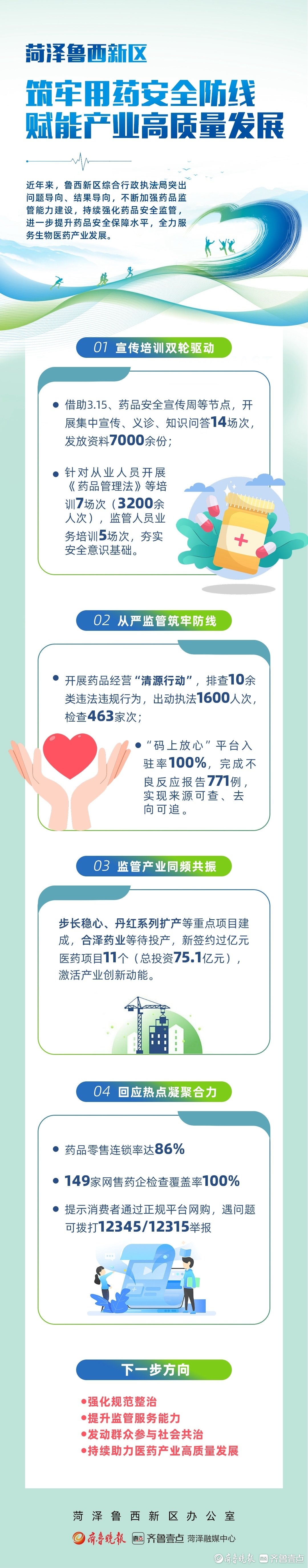Core Viewpoint - The Heze Luxi New Area has made significant progress in drug safety regulation and industry development, addressing public concerns and enhancing safety awareness through various initiatives [1][5]. Group 1: Drug Safety Regulation - The Luxi New Area has implemented a dual approach of "promotion + training" to enhance public and industry personnel's safety awareness, conducting multiple public outreach events and training sessions [2]. - A comprehensive regulatory system has been established, focusing on risk management and local oversight, with over 1,600 law enforcement personnel deployed to inspect 463 drug operating units this year [3]. - The "Code for Assurance" platform has achieved a 100% registration rate for drug operating units, ensuring traceability and quality control of drugs [3]. Group 2: Industry Development - The biopharmaceutical industry is a key sector in the Luxi New Area, with several major projects completed and new investments signed, totaling 7.51 billion yuan this year [4]. - The area has facilitated the growth of retail pharmacy chains, with 282 drug retail enterprises and a chain rate of 86%, promoting scale and efficiency in the industry [5]. Group 3: Public Engagement and Compliance - The Luxi New Area has strengthened online drug sales regulation, achieving a 100% inspection coverage of 149 online sales enterprises, while advising consumers to purchase from legitimate platforms [5]. - Future efforts will focus on enhancing regulatory services and encouraging public participation in drug safety governance, fostering a collaborative environment for high-quality industry development [5].