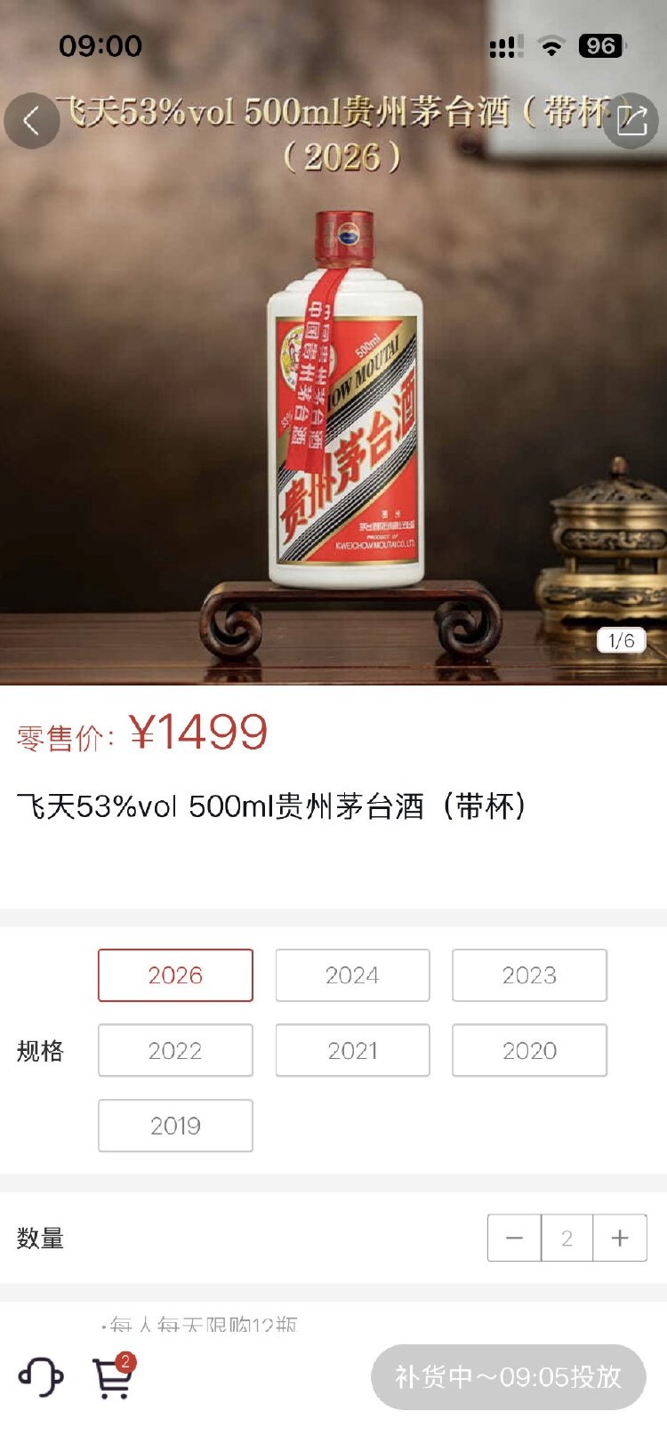 北京日报客户端消息,2026年1月1日上午9时,53度500毫升飞天茅台酒正式在i茅台APP线上发售,售价 1499元,上架后迅速被抢购一空。社交平台上,许多网友分享了自己"抢酒"失败的经历。记者了解到,目 前每位用户每日最多可购买12瓶,当日售完即止。此后,每日上午9时都将准点开售。业内分析认为,此 举意味着茅台营销体系正向市场化转型。 "普通人根本抢不到!" "新年快乐,大家快去抢茅台酒啊!"早上8点多,市民高先生的家族群里正互发新年问候,平价飞天茅台 酒上架的消息,成了今天一大早的大新闻。不到9点,高先生就守在手机边摩拳擦掌。 9点整,高先生第一时间点击"立即购买"按钮,页面却显示"库存补足"字样,随后,页面右下角下单按钮处 显示"补货中~09:05投放"。随后平台每隔5分钟补货一次,每次都瞬间销售一空,直至下单按钮显示"已售 罄"。"明天再试试,不信过年之前抢不到。"他笑道。 打开i茅台APP进入"i购"页面,可以看到飞天53度500毫升茅台酒、飞天100毫升和1升规格茅台酒,以及精 品系列、生肖系列、陈年酒系列、酒文化系列、低度酒系列等产品。其中,飞天53度500毫升茅台酒包含 2026年新酒和20 ...