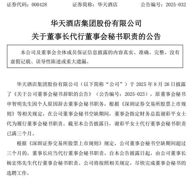 董秘“难产”!华天酒店董秘空缺3个月,董事长杨宏伟暂代职