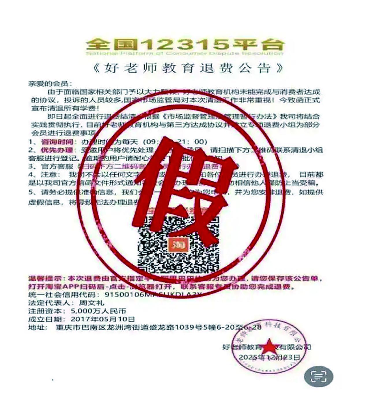 12月25日,巴南区市场监管局通报,近期收到不少市民反映,手机收到了自称"全国12315平台"关于"好老师教育退费公告"短信,询问该信息是否为真实信 息。对此,巴南区市场监管局提醒,类似格式的"红头文件"或"公告",是冒用国家机关名义,实施的"虚假退费"骗局。 经巴南区市场监管局调查,市场监管部门未对公告中企业进行所谓"清退"工作,也未发布关于该企业的退费公告。该公告杜撰不存在的法律法规名称,涉嫌 冒充国家机关名义实施诈骗。巴南区市场监管局已向公安机关移交案件线索。 巴南区市场监管局相关人士称,虚假退费诈骗披着"全国12315平台""市场监管局"等权威外衣,引导受骗者通过二维码、网址链接等方式下载安装可疑App, 窃取银行卡密码、手机验证码、生物识别特征等信息,需要警惕充值、解冻、提速等诈骗信号。防范此类诈骗的关键在于构建"官方核实——信息保护—— 冷静操作"的三道防线。 自称"全国12315平台"发布的"好老师教育退费公告"(截图) 上游新闻-重庆晨报记者 严薇 防骗提醒 该人士表示,任何涉及退费的通知,都应通过机构官网、官方App等原始渠道交叉验证,切勿轻信陌生短信或私人社交账号的信息。 首先,个人敏感信 ...