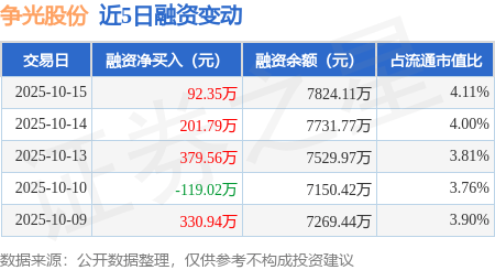 争光股份:10月15日融资净买入92.35万元,连续3日累计净买入673.69万元
