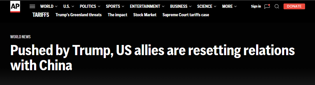 美联社近日发表的文章说,美国的盟友们正在重塑与中国的关系。 文章说,近期,美国的西方盟友们正在寻求与世界第二大经济体建立更密切的关系。加拿大总理卡尼访华,大幅削减对中国电动汽车等关税。英国首相斯 塔默访华修复了两国近年来的紧张关系,还有法国总统马克龙、爱尔兰总理马丁、韩国总统李在明、芬兰总理奥尔波也在过去几周访问了中国。 文章分析认为,自美国总统特朗普开启第二任期以来,世界秩序发生重大转变,美国最亲密的伙伴们与美国就关税问题、格陵兰岛问题等发生冲突。西方 盟友们开始探索与中国合作的机会。 尽管此举有惹恼美国的风险,但这些国家仍愿与中国重塑关系。 文章最后说,随着欧洲和其他美国盟友与中国越走越近,一些分析人士认为西方可能出现危险的分裂。 编译 | 杨琼 签审 | 张晗 监制 | 刘轶瑶 文章援引拉脱维亚国际事务研究所副所长乌娜·亚历山德拉·贝尔齐娜-切伦科娃(Una Aleksandra Bērziņa-Čerenkova)的观点说:"这种转向在某种意义上是 为欧洲作为一个整体的自保。" 巴黎欧盟安全研究所高级分析师蒂姆·吕利希(Tim Rühlig)认为,欧洲与世界两大最大经济体的关系发生了不可逆转的转变。 ...