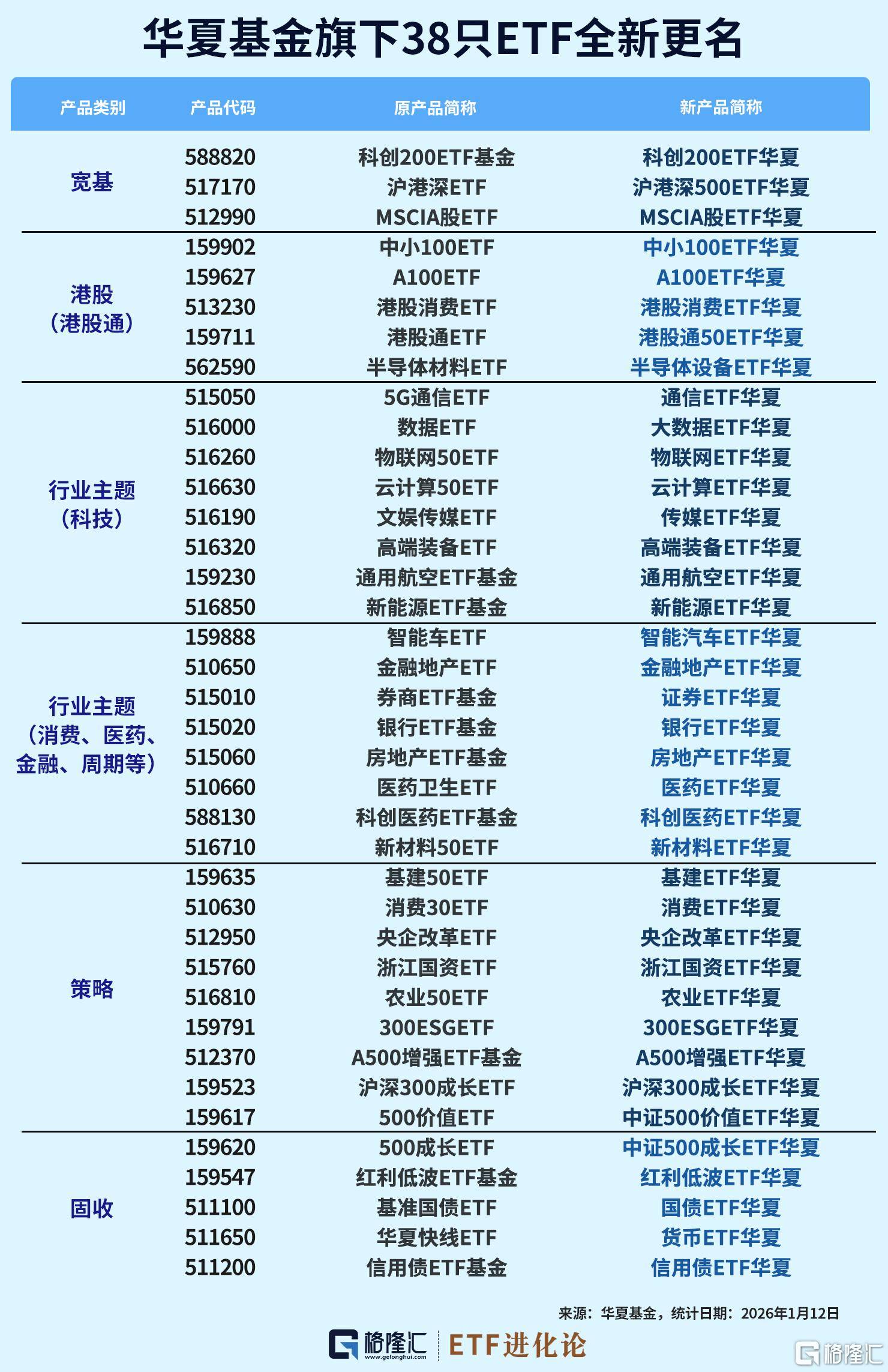 当中国ETF市场的规模以惊人的速度连续跨越4万亿、5万亿,站在6万亿的宏大关口之上,我们见证的不仅是数字的跃升,更是一个大资管时代从"高速增 长"向"高质量发展"的华丽转身。 站在2026年的起跑线上,在这个全球第二大ETF市场中,一场静水流深的基础性变革正在发生。 作为公募行业的领军者华夏基金率先行动。1月12日,旗下38只ETF集体更名! 此次调整中,38只ETF扩位简称统一采用了"投资标的核心要素+ETF+华夏"的标准化命名结构,基金代码及其他名称简称保持不变。这一改变,旨在助力投 资者在海量产品中"一眼识别华夏ETF"。 | 产品类别 | 产品代码 | 原产品简称 | | | --- | --- | --- | --- | | 竞 | 588820 | 科创200ETF基金 | | | | 517170 | 消耗教室 IF | ABA | | | 512990 | MSCIARGETF | IMI | | 港股 | 159902 159627 | 中小100ETF A100ETF | 다 | | | 513230 | 港股消费ETF | | | (完年版) | 159711 | 港股市F | | | ...