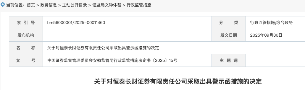 9月30日,根据安徽证监局发布的公告,恒泰长财证券有限责任公司受托管理的"23淮控01""23淮控02""23淮控03"募集资金被控股股东挪用,金额 超过募集资金总额的60%。上述行为违反了相关规定,恒泰长财证券被采取出具警示函的行政监管措施。 | 索 引 号 | bm56000001/2025-00011460 | 分 業 | 行政监管措施;综合政务 | | --- | --- | --- | --- | | 发布机构 | | 发文日期 | 2025年09月30日 | | ਸਮ 称 | 关于对恒泰长财证券有限责任公司采取出具警示函措施的决定 | | | | 를 文 | 中国证券监督管理委员会安徽监管局行政监管措施决定书〔2025〕15号 | 主题词 | | 安徽证监局指出,对于上述事项,恒泰长财证券未勤勉尽责,未能及时获取到发行人募集资金使用相关凭证、流水,同时没有履行募集说明书的 约定"在本次债券存续期内,受托管理人应当持续监督并每季度检查发行人募集资金的使用情况是否与募集说明书约定一致"。 上述行为违反了《公司债券发行与交易管理办法》(证监会令第180号)第六条、第六十条的规定。安徽证监局决定对恒泰长财 ...