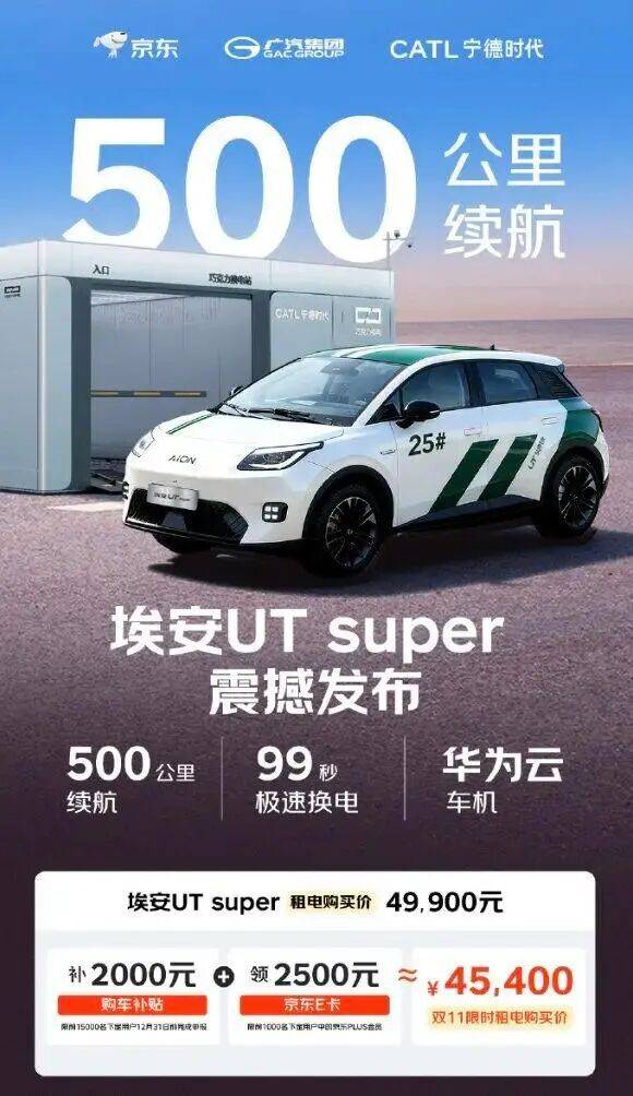 wumiancaijing.com 最热的泛财经新闻,都在这儿了。 重要提醒!!!为防失联,请"星标"我们!进入无冕财经公众号,点击右上角"...",再"",以便您及时接收每篇推送~ 本文由无冕财经(wumiancaijing)整理发布 资讯整理:海棠葉 编辑:程程 设计:岚昇 京东第一辆车,最低不到5万元 最快53秒生产一辆 11月9日,据埃安AION官微消息,由京东、广汽、宁德时代联合推出的埃安UT super正式官宣价格,整车购买价为8.99万元,电池租用购车价仅4.99万 元,叠加汽车补贴及京东E卡补贴PLUS会员最低可至4.54万元。 据悉,该车将在京东独家销售,即日起在京东APP搜索"国民好车"即可预约试驾、支付定金。同时,三方还联合推出返现、增值、价保三大权益,为用户 购车用车提供多重保障。 ▲京东第一辆车定价,图源网络 11月5日,由京东、宁德时代和广汽埃安三方联手打造的"国民好车"埃安UT super 1号车,在广汽埃安长沙"全球灯塔工厂"迎来下线。 / 据工厂人员介绍,最快53秒就能生产一辆埃安UT Super。工厂车间现场人士透露,为保证第1批客户按时交付,工厂流水线已满负荷运营生产,工 ...