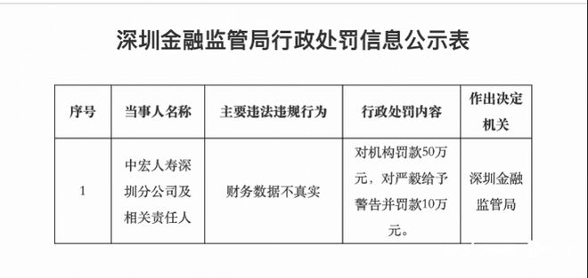 更早的2023年6月,中宏人寿总公司曾因三重违规被上海银保监局重罚:包括2020年四季度偿付能力报 告数据不真实;2020年至2021年上半年财务数据不真实;以及保险资金投资基础设施项目独立监督人不 符合条件等问题,合计被罚80万元。 此外,今年3月,中宏人寿四川分公司因"给予投保人保险合同约定以外的利益"及"未按规定履行对代理 人行为管理的职责"等问题,被警告并罚款17万元,相关责任人也受到相应处罚。 采写:南都·湾财社记者 罗曼瑜 近日,国家金融监督管理总局深圳监管局公布的行政处罚信息显示,中宏人寿保险有限公司深圳分公司 因"财务数据不真实"问题,被处以50万元罚款,时任相关责任人严毅被给予警告并罚款10万元,合计罚 金60万元。 | | | 深圳金融监管局行政处罚信息公示表 | | | | --- | --- | --- | --- | --- | | 序号 | 当事人名称 | 主要违法违规行为 | 行政处罚内容 | 作出决定 机关 | | 1 | 中宏人寿深 圳分公司及 相关责任人 | 财务数据不真实 | 对机构罚款50万 元,对严毅给予 警告并罚款10万 元。 | 深圳金融 监管局 | 公开资料显示 ...