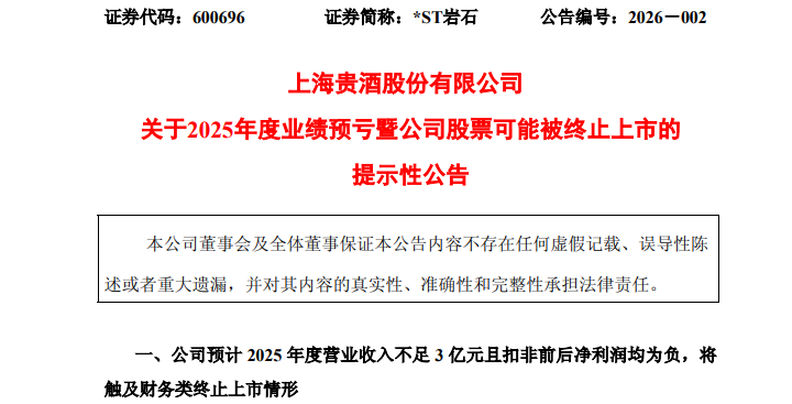 *ST岩石(600696)响起"退市警报"! 1月12日晚,*ST岩石公告,经公司财务部门初步测算,预计公司2025年度营业收入低于3亿元,且利润 总额、净利润或者扣除非经常性损益后的净利润孰低者为负值。 *ST岩石表示,根据《上海证券交易所股票上市规则》的相关规定,2025年度经审计营业收入低于3亿 元且利润总额、净利润或者扣除非经常性损益后的净利润孰低者为负值的,公司股票将因触及财务类退 市情形被终止上市。 根据*ST岩石此前公告,2025年前三季度,公司累计实现营业收入3476.21万元,实现归属于上市公司股 东的净利润-1.12亿元。 *ST岩石全称为上海贵酒股份有限公司,其"前身"系在资本市场颇有知名度的匹凸匹。2018年12月,公 司以228.24万元的价格收购了贵州贵酒云电子商务有限公司85%的股权,该公司为一家白酒销售线上平 台,公司打算以此为切入点试水白酒销售行业。 2021年,*ST岩石主动调整和收缩了融资租赁及商业保理业务,全力推进白酒业务发展。当年公司实现 营收6.03亿元,归母净利润6192.82万元。2022年,公司进一步聚焦白酒行业,当年营业收入超过10亿 元。 2023年是*S ...