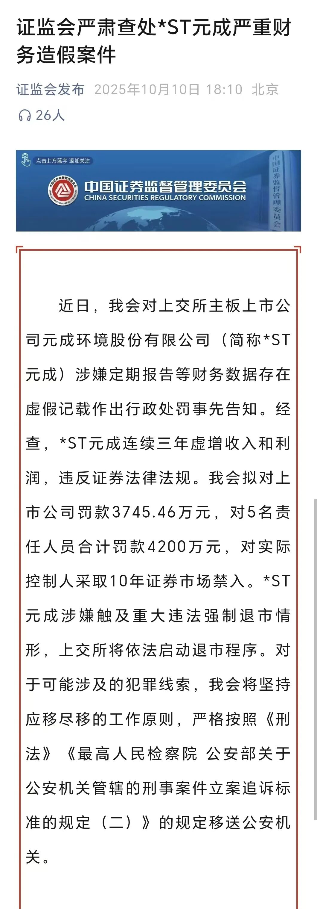来源|智通财经、证监会官网 证监会拟对上市公司罚款3745.46万元,对5名责任人员合计罚款4200万元,对实际控制人采取10年证券市场禁入。 *ST元成涉嫌触及重大违法强制退市情形,上交所将依法启动退市程序。对于可能涉及的犯罪线索,证监会将坚持应移尽移的工作原则,严格按照《中华 人民共和国刑法》《最高人民检察院公安部关于公安机关管辖的刑事案件立案追诉标准的规定(二)》的规定移送公安机关。 据证监会官网消息,近日,证监会对上交所主板上市公司元成环境股份有限公司(简称*ST元成)涉嫌定期报告等财务数据存在虚假记载作出行政处罚事 先告知。经查,*ST元成连续三年虚增收入和利润,违反证券法律法规。 ...