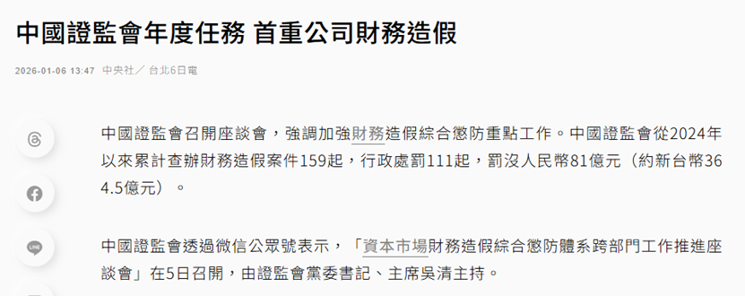 Core Viewpoint - The Chinese regulatory authorities are enhancing the comprehensive prevention and punishment system for financial fraud in the capital market, with a focus on strengthening collaboration among various departments to ensure effective enforcement and accountability [1][2][3]. Group 1: Regulatory Developments - The China Securities Regulatory Commission (CSRC) held a meeting on January 5, 2024, with representatives from multiple government departments to discuss the advancement of the comprehensive prevention and punishment system for financial fraud [1]. - Since the issuance of the "Comprehensive Prevention and Punishment Opinions" on July 5, 2024, a multi-faceted accountability system has been established, integrating administrative enforcement, criminal punishment, civil recovery, and integrity constraints [1]. Group 2: Prosecution Statistics - From 2024 to November 2025, a total of 191 individuals were prosecuted for financial fraud, with 102 prosecutions occurring between January and November 2025, representing a 21% year-on-year increase [2]. - Major financial fraud cases, including those involving Jinzhou Port, Jintongling, Meishang Ecology, and Zijing Storage, have been publicly prosecuted, demonstrating a strong deterrent effect against financial fraud [2]. Group 3: Future Directions - The prosecutorial authorities plan to continue implementing Xi Jinping's legal thought and directives regarding the capital market, increasing criminal accountability for financial fraud, and enhancing collaboration among departments [3]. - There will be a focus on improving case handling standards and exploring the integration of civil and criminal accountability to better protect investors' rights and support the high-quality development of the capital market [3].
