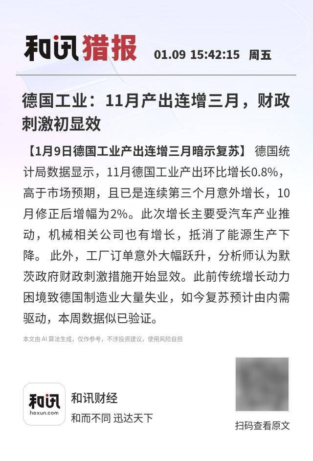 德国工业:11月产出连增三月,财政 刺激初显效 【1月9日德国工业产出连增三月暗示复苏】德国统计局数据显示,11月德国工业产出环比增长0.8%, 高于市场预期,且已是连续第三个月意外增长,10月修正后增幅为2%。此次增长主要受汽车产业推 动,机械相关公司也有增长,抵消了能源生产下降。此外,工厂订单意外大幅跃升,分析师认为默茨政 府财政刺激措施开始显效。此前传统增长动力困境致德国制造业大量失业,如今复苏预计由内需驱动, 本周数据似已验证。 本文由 AI 算法生成,仅作参考,不涉投资建议,使用风险自担 和讯猎报 01.09 15:42:15 周五 和讯财经 和而不同 迅达天下 扫码查看原文 【1月9日德国工业产出连增三月暗示复苏】 德国统 计局数据显示,11月德国工业产出环比增长0.8%, 高于市场预期,且已是连续第三个月意外增长,10 月修正后增幅为2%。此次增长主要受汽车产业推 动,机械相关公司也有增长,抵消了能源生产下 降。此外,工厂订单意外大幅跃升,分析师认为默 茨政府财政刺激措施开始显效。此前传统增长动力 困境致德国制造业大量失业,如今复苏预计由内需 驱动,本周数据似已验证。 本文由 Al 算法生成,仅 ...