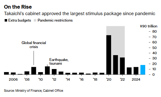 "我们制定这份计划是为了保障民生,尤其要快速应对通胀问题,"高市早苗在措施细节公布后表示。 智通财经APP获悉,日本首相高市早苗内阁批准了自新冠疫情以来规模最大的一轮额外支出计划,通过 资金投放回应选民诉求,但此举可能会引发关注日本财政状况的投资者担忧。 日本内阁府周五透露,这一刺激计划包含17.7万亿日元(约合1120亿美元)的一般账户支出,资金大概率 通过追加预算筹措,较其前任一年前推出的规模增长27%。计划总规模达21.3万亿日元(约合1354亿美 元),核心举措聚焦物价纾困。 其他抗通胀举措包括:划拨约1万亿日元用于取消汽油税(这一措施最初由自民党的新联合执政伙伴"日 本维新会"等在野党提出);提高个人所得税起征点——另一个最初源自在野党的想法——也被采纳,耗 资1.2万亿日元。 根据日本内阁府的估算,这些物价措施预计将在明年2月至4月期间,将使整体通胀指标平均拉低0.7个 百分点。 该计划还包含1.7万亿日元用于强化国防和外交能力,其中1.1万亿日元将助力日本在本财年将国防支出 提升至国内生产总值(GDP)的2%——高市早苗此前已将这一目标时间表提前两年。另有7.2万亿日元将 用于危机管理相关投资。 ...