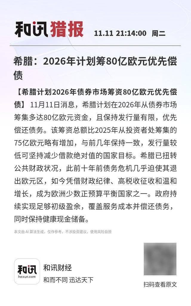 【希腊计划2026年债券市场筹资80亿欧元优先偿债】11月11日消息,希腊计划在2026年从债券市场筹集 多达80亿欧元资金,且保持发行量有限,优先偿还债务。该筹资总额比2025年从投资者处筹集的75亿欧 元略有增加,与前几年保持一致,发行量较低可坚持减少借款绝对值的国家目标。希腊已扭转公共财政 状况,此前十年前债务危机几乎迫使其退出欧元区,如今凭借财政纪律、高税收征收和温和增长,成为 欧洲少数正预算平衡国家之一。政府持续实现足够初级盈余,覆盖服务成本并偿还债务,同时保持健康 现金储备。 本文由 Al 算法生成,仅作参考,不涉投资建议,使用风险自担 和讯财经 和而不同 迅达天下 扫码查看原文 本文由 AI算法生成,仅作参考,不涉投资建议,使用风险自担 和闭猎报 11.11 21:14:00 周二 希腊:2026年计划筹80亿欧元优先偿 信 【希腊计划2026年债券市场筹资80亿欧元优先偿 债】11月11日消息,希腊计划在2026年从债券市场 筹集多达80亿欧元资金,且保持发行量有限,优先 偿还债务。该筹资总额比2025年从投资者处筹集的 75亿欧元略有增加,与前几年保持一致,发行量较 低可坚持减少借款绝对值的 ...