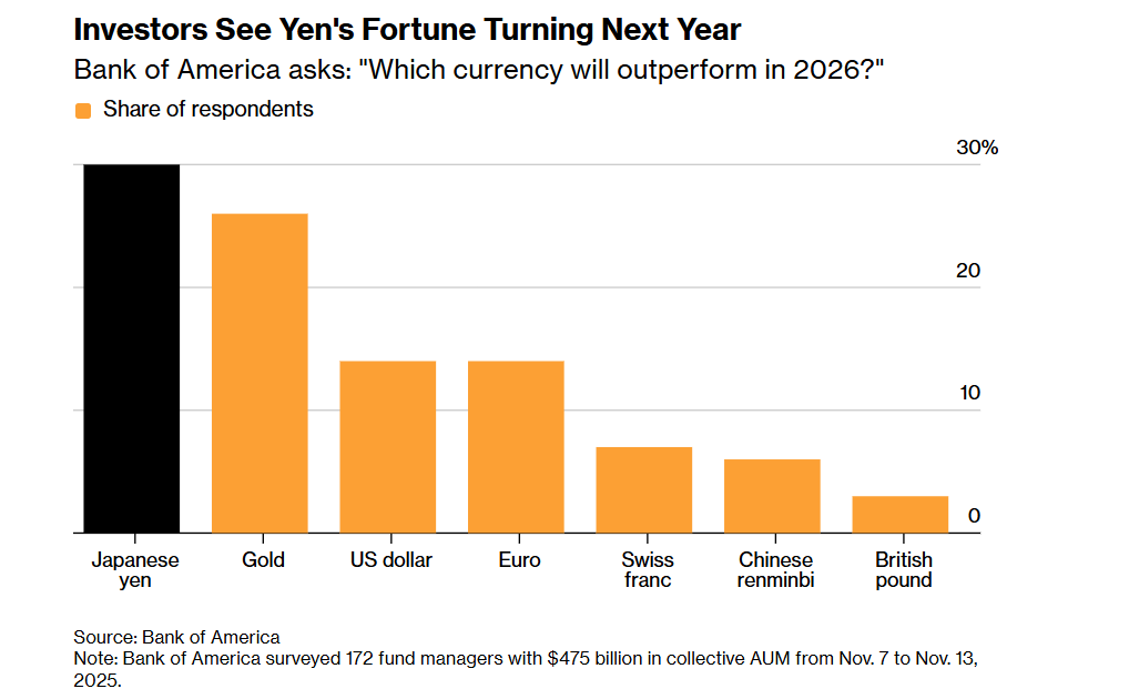 美银调查:全球投资者押注日元明年“逆袭”,黄金美元次之