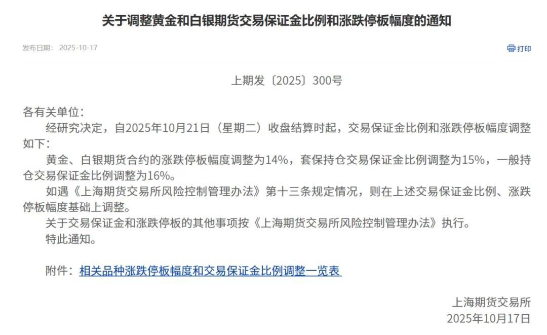 Core Viewpoint - The Shanghai Futures Exchange has announced adjustments to the margin ratios and price fluctuation limits for gold and silver futures contracts, effective from October 21, 2025, in response to market conditions [1][3]. Group 1: Margin and Price Fluctuation Adjustments - The price fluctuation limit for gold and silver futures contracts will be adjusted to 14%, with the margin ratio for hedged positions set at 15% and for general positions at 16% [3][4]. - Current standards for gold are a price fluctuation limit of 12% and a margin ratio of 13% for hedged positions, while for silver, the limits are 12% and 14% respectively [4]. Group 2: Market Performance and Risk Management - On October 17, the domestic precious metals futures market experienced a strong upward trend, with the main gold futures contract reaching a historical high of 999.80 yuan per gram [5]. - The main silver futures contract peaked at 12,366 yuan per kilogram, closing at 12,249 yuan per kilogram with a 2.06% increase [7]. - The rapid increase in gold prices has raised risk alerts, prompting the Shanghai Futures Exchange and the Shanghai Gold Exchange to issue notifications urging market participants to enhance risk management and investor awareness [7].