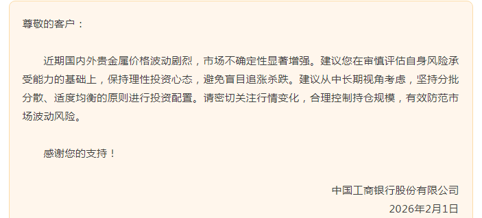 2026.02. 01 2月1日, 中国工商银行股份有限公司发布" 关于进一步做好贵金属市场风险防范的提示"。 工行表示,近期国内外贵金属价格波动剧烈,市场不确定性显著增强。建议您在审慎评估自身风险承 受能力的基础上,保持理性投资心态,避免盲目追涨杀跌。建议从中长期视角考虑,坚持分批分散、 适度均衡的原则进行投资配置。请密切关注行情变化,合理控制持仓规模,有效防范市场波动风险。 图源| "工银金行家"微信公众号 微信编辑 | 雨林 第 一 财 经 持 续 追 踪 财 经 热 点 。 若 您 掌 握 公 司 动 态 、 行 业 趋 势 、 金 融 事 件 等 有 价 值 的 线 索 , 欢 迎 提 供 。 专 用 邮 箱 : bianjibu@yicai.com (注:我们会对线索进行核实。您的隐私将严格保密。) 推荐阅读 飞天茅台价格全线上涨 ...