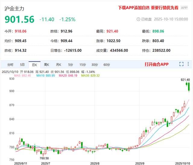 来看国外投资机构对黄金的看法。 道明证券预计,较低的价位仍是买入机会,2026年国际金价的上行趋势或将在上半年保持不变。随着美 联储逐渐进入更高的通胀环境,国际金价的平均价格或将在明年前6个月达到4400美元/盎司以上的新纪 录,全年平均价格或将在4250美元/盎司附近。 日内收盘,沪金下跌1.25%,报收901.56元/克。 期货公司观点 广发期货: 展望四季度,尽管美国经济运行保持一定韧性但在就业市场衰退风险下,美联储政策降息路径呈现"预 期强化-独立性受挫"的双重特征并打压美元指数。目前伴随美国政府关门和欧洲日本等发达国家的财政 货币政策动荡影响持续发酵,新的资产定价体系将重塑利好金融属性强的商品货币,使贵金属有望重现 类似 1970 年代的牛市行情,价格易涨难跌,但短期特朗普政策不确定性和中东和平等地缘政治局势演 变将影响行情上涨节奏。操作上单边保谨慎低多思路,期权在波动率见顶后可逢高卖出虚值期权。 法国外贸银行预计未来两到三个月,国际金价可能面临下行风险,杠杆投资者需要平仓和部分获利了结 可能导致国际金价在几天内下跌5%~10%。如果美国国会通过新的拨款法案以结束目前的停摆,国际金 价也可能因此下跌 ...