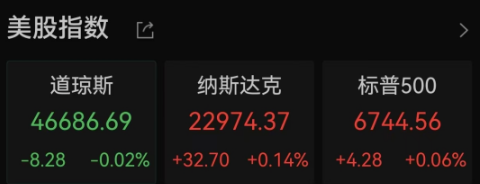 10月7日晚,美股三大股指小幅高开。截至发稿,道琼斯指数下跌0.02%,纳斯达克指数涨0.14%,标普500指数涨0.06%。 | 美股指数 | | | | --- | --- | --- | | 道琼斯 | 纳斯达克 | 标普500 | | 46686.69 | 22974.37 | 6744.56 | | -8.28 -0.02% +32.70 +0.14% +4.28 +0.06% | | | 中概股涨跌不一。纳斯达克中国金龙指数跌逾0.7%,小牛电动跌逾4%、名创优品、逸仙电商等跌逾2%。 | < W | 纳斯达克中国金龙指数(HXC) | | | | | | --- | --- | --- | --- | --- | --- | | | 10-07 10:04:38 | | | | | | 8770.17 | 8838.50 | 昨收 | | 成交额 | 0 | | -68.32 | -0.77% | 今开 | 8850.31 | 成交量 | 0 | | 上 涨 | 0 | 平 盘 | 0 | 下 跌 | 0 | | 最高价 | 8855.01 | 市智率 | 23.8 | 近20日 | 6.55% ...
