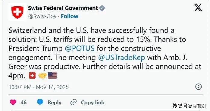 美国与瑞士达成贸易协议,将瑞士商品关税下调至15%