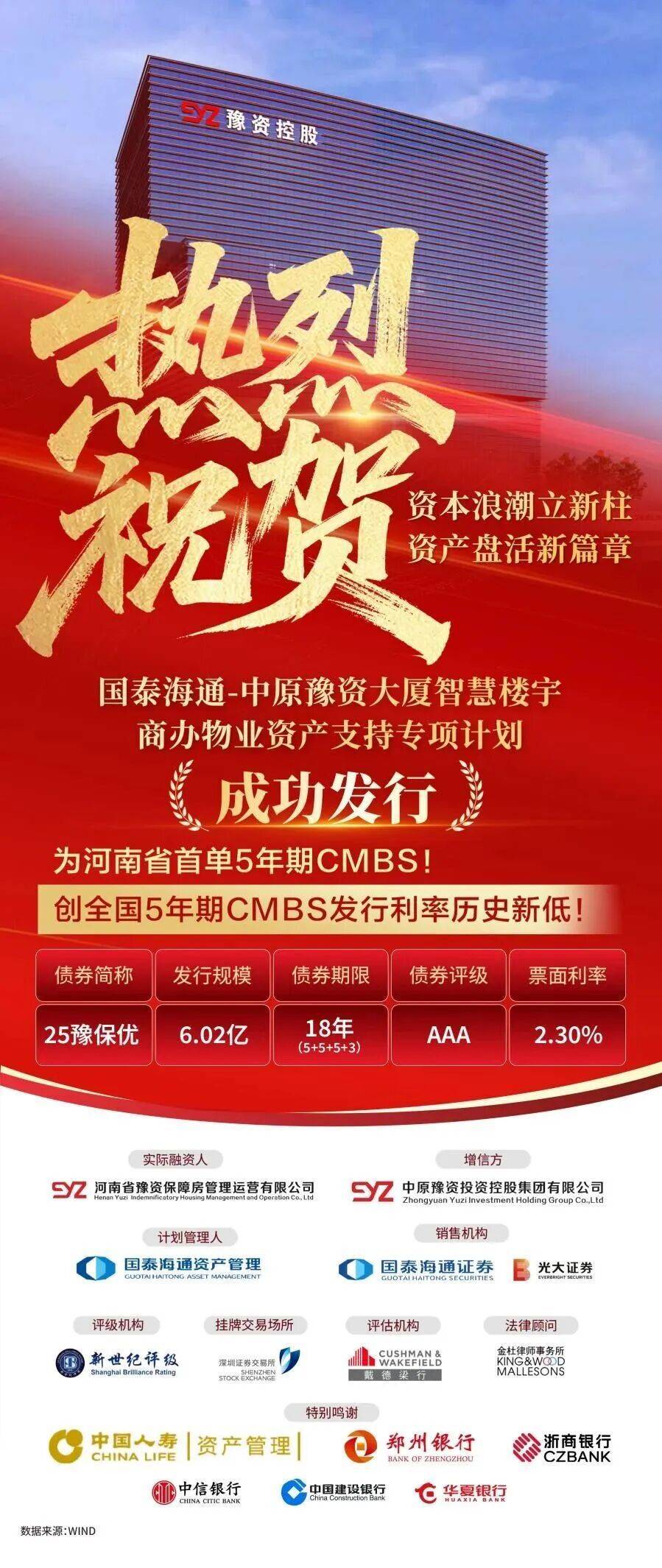 【大河财立方消息】11月20日,豫资保障房公司作为发行人的 "国泰海通-中原豫资大厦智慧楼宇商办物业资产支持专项计划"在 深交所完成发行,规模6.03亿元,期限18年(5+5+5+3),利率2.3%,以全场认购倍数超3.4倍的市场表现,创下全国5年期 CMBS历史最低票面利率。 本计划既是近五年来首单省属国有企业5年期含权CMBS,也是河南省首单5年期CMBS。 本次CMBS发行采用创新性的跨区域资产打包模式,覆盖5省5城的多元物业组合,通过"1大带5小"的灵活架构,将核心资产与多 个零散小额物业整合,突破区域分散资产独立融资难、组包融资受限的行业瓶颈,充分释放物业潜在价值,获得了银行、保 险、信托及证券公司等多类投资人的关注与支持,为国有存量资产盘活提供了可复制的示范案例。 责编:陈玉尧 | 审核:李震 | 监审:古筝 ...