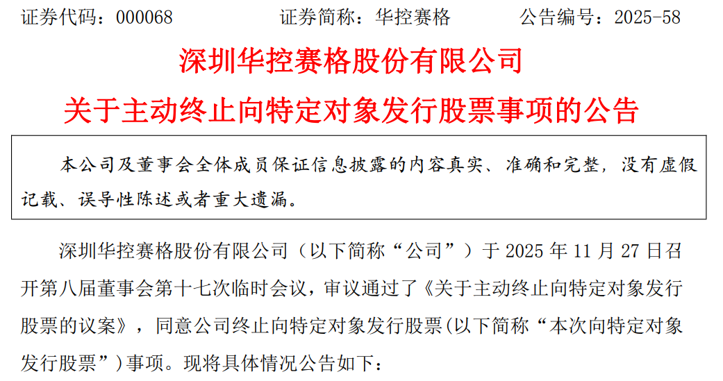 华控赛格(000068)11月28日晚间发布公告称,公司于2025年11月27日召开第八届董事会第十七次临时会议,审议通过了《关于主动终止向特定对 象发行股票的议案》,同意公司终止向特定对象发行股票事项。 华控赛格筹划此次定增由来已久。早在2023年8月7日,公司就召开第七届董事会第二十一次临时会议、第七届监事会第十五次临时会议,于2023年 11月27日召开2023年第二次临时股东会,审议通过了《关于公司 <向特定对象发行a股股票预案> 的议案》《关于提请股东大会授权董事会全权办理 公司2023年度向特定对象发行股票相关事宜的议案》。 不过,2024年12月2日公司召开2024年第二次临时股东会,审议通过了《关于延长向特定对象发行股票股东大会决议和授权有效期的议案》,向特定 对象发行股票项目有效期自前次有效期届满之日起延长12个月(延长至2025年12月11日)。 华控赛格原拟向控股股东华融泰发行股票募集资金总额不超过8.46亿元,扣除发行费用后净额全部用于偿还有息借款。 彼时,华控赛格资产负债率高达90.19%,长期借款达9.39亿元,负债率较高,有息债务较重,项目占用资金较大,应收账款与合同资产占比较高 ...
