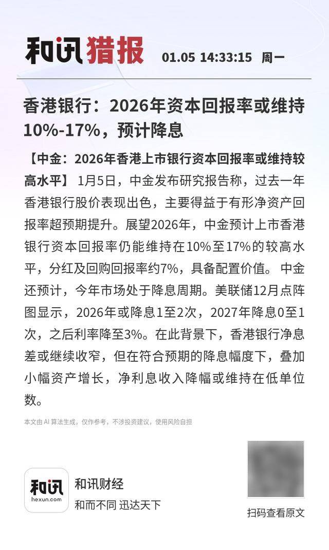 【中金:2026年香港上市银行资本回报率或维持较高水平】1月5日,中金发布研究报告称,过去一年香 港银行股价表现出色,主要得益于有形净资产回报率超预期提升。展望2026年,中金预计上市香港银行 资本回报率仍能维持在10%至17%的较高水平,分红及回购回报率约7%,具备配置价值。 中金还预 计,今年市场处于降息周期。美联储12月点阵图显示,2026年或降息1至2次,2027年降息0至1次,之后 利率降至3%。在此背景下,香港银行净息差或继续收窄,但在符合预期的降息幅度下,叠加小幅资产 增长,净利息收入降幅或维持在低单位数。 本文由 AI算法生成,仅作参考,不涉投资建议,使用风险自担 # hexun.com 和讯财经 和而不同 迅达天下 扫码查看原文 ...
