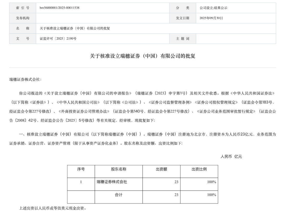 外资券商加速抢滩中国市场。 中国证监会9月30日发布关于核准设立瑞穗证券(中国)有限公司的批复。 | 索 引 号 | bm56000001/2025-00011538 | 分 类 | 公司设立;结果公示 | | --- | --- | --- | --- | | 发布机构 | | 发文日期 | 2025年09月30日 | | 名 称 | 关于核准设立瑞穗证券(中国)有限公司的批复 | | | | 文 号 | 证监许可〔2025〕2190号 | 主题词 | | | 序号 | 股东名称 | 出资额 | 出资比例 | | | --- | --- | --- | --- | --- | | - | 瑞穗证券株式会社 | | 23 | 100% | | | 合计 | | 23 | 100% | 图片来源:证监会网站 包括瑞穗证券在内,今年以来,多家外资券商在华展业的"进度条"更新。 瑞穗证券株式会社出资比例100% 中国证监会公告显示,瑞穗证券(中国)注册地为北京市,注册资本为人民币23亿元,业务范围为证券承销、证券自营、证券资产管理(限于从事资产证 券化业务)。瑞穗证券株式会社出资比例100%。 公司应当自该批复下发 ...