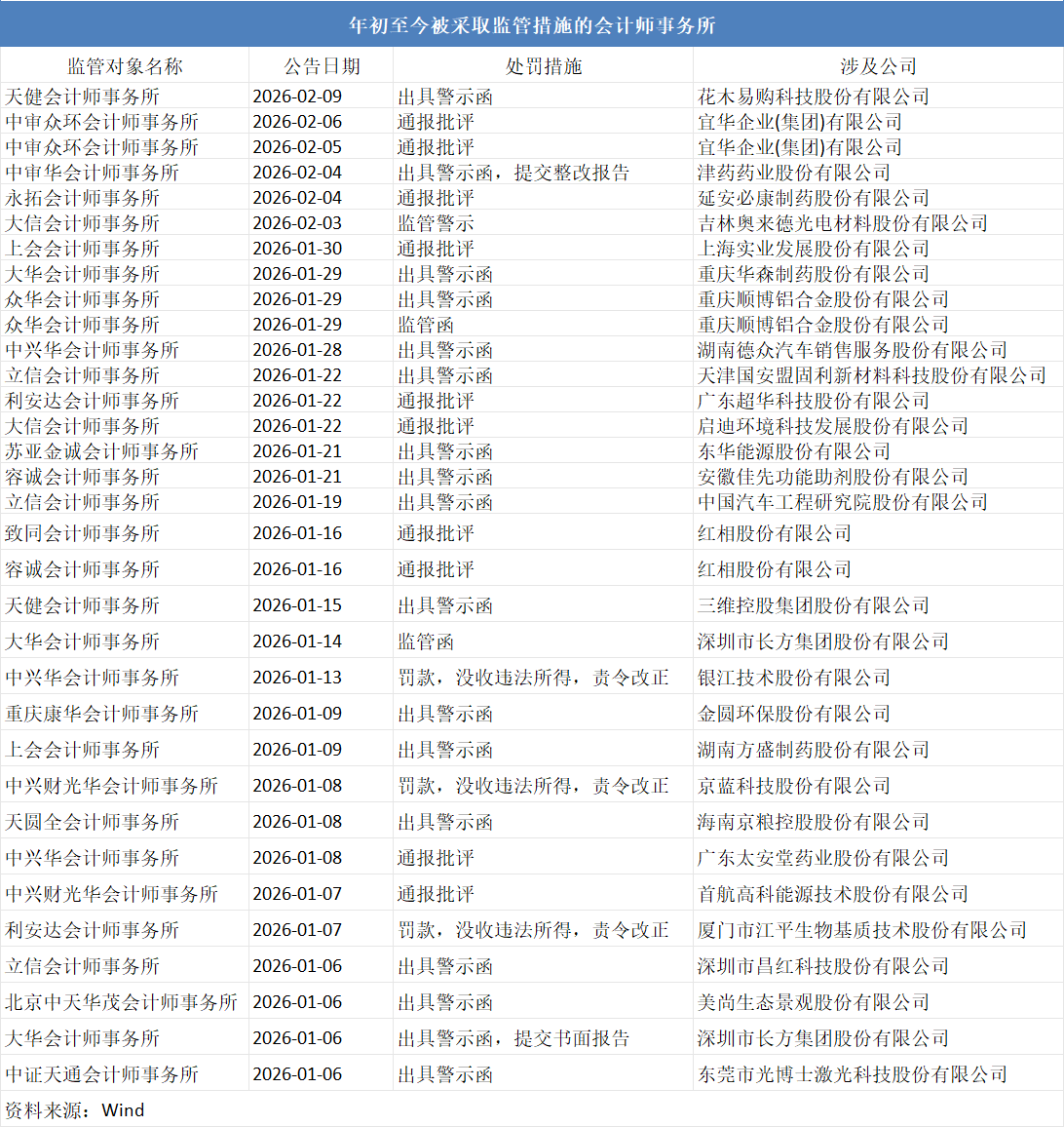 会计所被罚的连锁反应持续显现,A股公司陆续与其"分手"。 2026年开年不到一个半月,就有19家会计师事务所吃下罚单,部分机构更是多次被"点名"。 据厦门证监局最新披露,因在花木易购科技股份有限公司部分财报审计中收入审计程序、应收账款审计程序执行不到位,天健会计师事务所(下称"天健 所")及3名注册会计师被出具警示函。 在此之前,另一家会计所刚刚被罚。披露显示,近期,中审众环会计师事务所(下称"中审众环")被沪深交易所联合处罚,事发宜华企业(集团)有限公 司项目中存在违规。 第一财经根据Wind统计,包括上述机构在内,年初至今,共有19家会计师事务所被采取监管措施达33次。其中,部分会计所连连被罚,涉及大华会计师事 务所、立信会计师事务所等;部分会计所吃下大额罚单,中兴华会计师事务所因银江技术项目被"没一罚一"超千万元。 会计所被处罚的连锁反应也在持续显现。早前,*ST立方(300344.SZ)被查明存在长期财务造假,提供年审服务的中兴财光华被立案,此后,该所的A股 客户公司陆续与之"分手"。记者关注到,目前,中兴财光华的客户流失仍在持续,有A股公司最新披露称改聘他所。 月内已有5家会计所被罚 本月以来,已有 ...