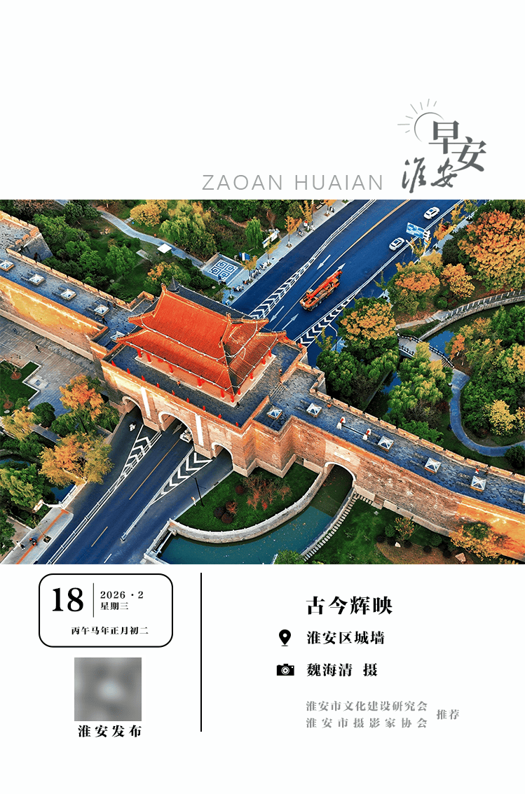 淮粉们,早上好呀 今天白天到夜里晴到多云 偏西风转偏南风3到4级 今天最高气温13到14℃ 明晨最低气温0到-1℃ 今天空气干燥 昼夜温差较大 请多补充水分 时政速递 注意用火用电安全 打卡地 | 古今辉映 | | --- | | 9 淮安区城墙 | | ○ 魏海清 摄 | 策马扬鞭开新局,一马当先创辉煌。农历大年初一,市委书记史志军、市长顾坤调研节日期间企业运行和安全生产工作,看望慰问坚守岗位的一线职工, 向大家致以诚挚问候和新春祝福。史志军强调,要全力加快发展跨越赶超,守好安全生产底线,推动项目建设形成更多实物工作量,为"十五五"开局向前 向上向好奠定坚实基础。市委常委、秘书长徐子佳,市政府秘书长马乃骏,市政协秘书长、市发改委主任蒋继贵,淮安经开区党工委书记刘爱国分别参加 活动。 小布推荐 拼手速!免费看电影 新春福利到!记者从省总工会获悉,2026年,江苏省总工会将联合省电影局投入500万元,带动各级工会配套3000万元,全年发放观影消费券。 正月初一至正月初七,全省工会会员可领50元电影通兑券,邀您光影里过个"苏"式幸福年! 今年,省总将面向全省工会会员分批发放50元电影通兑券,可在省内合作影院兑换任 ...