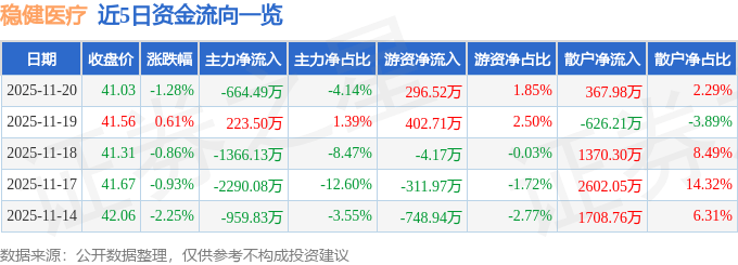 股票行情快报:稳健医疗(300888)11月20日主力资金净卖出664.49万元