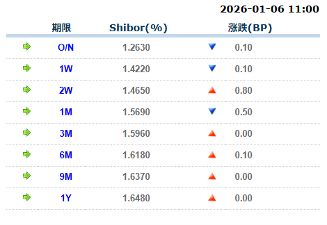 | | | | 2026-01-07 11:00 | | --- | --- | --- | --- | | | 期限 | Shibor(%) | 涨跌(BP) | | 1 | O/N | 1.2660 | 0.30 | | 个 | 1W | 1.4500 | 2.80 | | t | 2W | 1.4530 | 1.20 | | t | 1M | 1.5640 | 0.50 | | 价 | 3M | 1.5970 | 0.10 | | 价 | 6M | 1.6190 | 0.10 | | fr | 9M | 1.6370 | 0.00 | | 1 | 1Y | 1.6490 | 0.10 | 上海银行间同业拆放利率(1月7日) 来源:全国银行间同业拆借中心 银行间质押式回购市场方面,短期资金利率整体波动不大,隔夜品种量价齐升。具体看,DR001、R001加权平均利率分别上行0.5BP、0.6BP,报 1.2674%、1.3365%,成交额分别增加1502亿元、3763亿元;DR007、R007加权平均利率分别上行3.0BP、3.9BP,报1.4625%、1.5323%,成交额分 别减少1亿元、550亿元;D ...