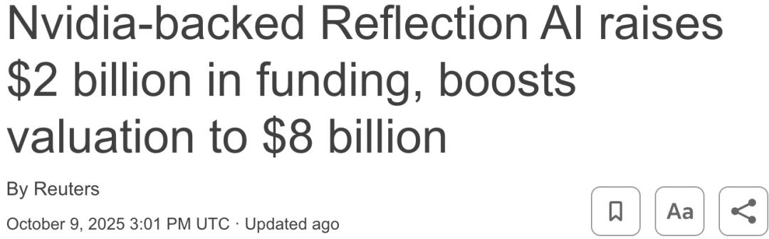 昔日AlphaGo和Gemini幕后英雄联手创业!Reflection AI获20亿美元融资,英伟达投钱,目标打造「十万亿token级」模型,让AI不再被少数人 掌控。 在AI资本竞速的战场上,美国投资者正用真金白银押注未来! 据PitchBook统计,全球AI基础模型公司去年融资349亿美元;今年,已融资翻番至719亿美元。 刚刚,DeepMind前研究员创立、成立一年多的AI初创Reflection AI,竟斩获高达20亿美元融资。估值瞬间飙升至80亿美元! 从谷歌前CEO施密特到英伟达,再到红杉、花旗,顶级玩家争相入局,一场围绕开源AI主权的科技冷战,正在燃起资本最狂热的火焰。 开源VS闭源、算力VS人才、美国VS中国,Reflection AI宣称要打造「美版DeepSeek」,在AI新时代夺回技术话语权。 关于未来智能控制权的终极对决,正在悄然拉开帷幕。 AI决战之时 Misha Laskin(下图左)曾主导DeepMind「Gemini」项目中的奖励建模工作;Ioannis Antonoglou(下图右)则参与了2016年打败围棋世界冠军的AI系统 AlphaGo的开发。 创始人的经历成为公司核心 ...