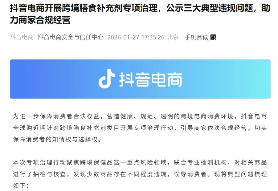 当"海外直邮"的噱头遇上成分违规的真相,跨境进口保健品的"健康神话"正在被划破。 近日,抖音电商开展跨境膳食补充剂专项治理,公示了一系列跨境膳食补充剂违规案例,引发行业震动;典型问题案例中,多款宣称可"清理肠道"的产 品,因检出非法添加"番泻苷A/B",被依法清退。 图源:公众号截图 在"通便""减肥""排毒"等营销话术包装下,一些打着"天然""植物提取"旗号的进口保健品,悄然绕过监管红线,通过跨境电商潜入国内市场。 而当国外的"安全标准"撞上国内的"成分红线",消费者该如何规避风险?这种背景下,行业又该如何规范经营? 01 清退令背后的"违禁成分" 1月27日,抖音电商发布了关于"跨境膳食补充剂专项治理"的公告,指出"少数商品在检测中被发现含有未经我国相关法规许可的风险物质或违禁成分,存 在明显的合规及安全隐患";其中,抖音电商在问题案例中提到"番泻苷A、番泻苷B"成分,并指出相关商家或商品已被依法依规清退处置。 番泻苷,究竟是何物?这个对普通消费者而言陌生的化学名词,实则是《中国药典》明确收录的中药材"番泻叶"的核心活性成分。番泻叶,又名辛纳叶、 泡竹叶、塞纳叶,但这些别名成为商家误导消费者的惯用伎俩。在 ...