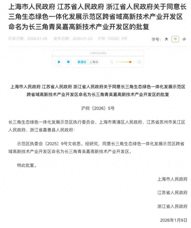 全国首个跨省域高新区命名获批。 近日,上海市政府官网发布《上海市人民政府 江苏省人民政府 浙江省人民政府关于同意长三角生态绿 色一体化发展示范区跨省域高新技术产业开发区命名为长三角青吴嘉高新技术产业开发区的批复》。 江苏省人民政府 浙江省人民政府 2026年1月9日 智通财经记者 朴姜 长三角生态绿色一体化发展示范区执行委员会、上海市青浦区人民政府、江苏省苏州市吴江区人民政 府、浙江省嘉善县人民政府: 示范区执委会〔2025〕9号文收悉。经研究,同意长三角生态绿色一体化发展示范区跨省域高新技术产 业开发区命名为长三角青吴嘉高新技术产业开发区。 特此批复。 上海市人民政府 据新华社此前报道,2023年7月底,长三角生态绿色一体化发展示范区迎来全国首个跨省域高新技术产 业开发区的成立。高新区包含上海青浦、江苏吴江、浙江嘉善3个片区,占地19.54平方公里,将依托长 三角区域丰富的科技创新资源和高新技术产业发展基础,重点发展数字产业、智能制造、绿色新材料三 大战略性新兴产业和总部经济、绿色科创服务两大特色产业,形成"3+2"主导产业发展格局。 附:《上海市人民政府 江苏省人民政府 浙江省人民政府关于同意长三角生态绿 ...