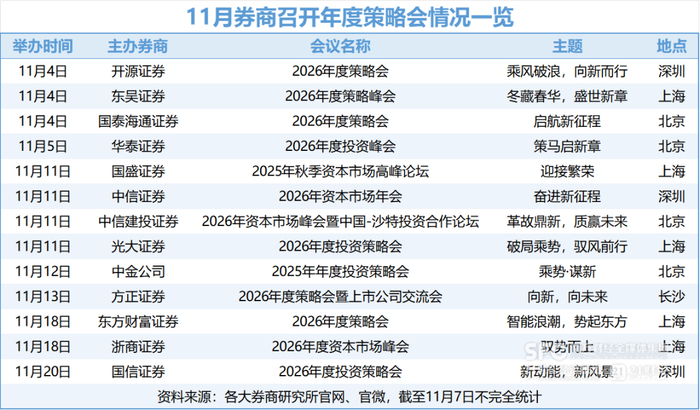 记者丨孙永乐 编辑丨巫燕玲 11月以来,券商2026年度策略会进入密集举办期,研究大咖与资深专家、行业领袖围绕市场热点及2026 年投资策略分享真知灼见,吸引公募、私募、银行、保险、上市公司等各类投资者参与交流。 21世纪经济报道记者注意到,本周已有开源证券、东吴证券、国泰海通证券、华泰证券等4家卖方机构 召开2026年度策略会,对即将到来的2026年的宏观经济形势、"十五五"规划、资本市场投资策略、上市 公司高质量发展前景等进行展望和探讨。 11月4日,东吴证券"冬藏春华,盛世新章"2026年度策略峰会在上海开幕,议题围绕泛AI、创新药、反 内卷等多个热门领域; 11月4日,开源证券召开2026年度策略会,以"乘风破浪,向新而行"为主题,展望2026年宏观经济形 势、"十五五"规划、资本市场投资策略; 据记者不完全统计,进入11月密集举办期,还将有9家券商陆续举办2026年度策略会,包括国盛证券、 中信证券、中信建投证券、光大证券、中金公司、方正证券、东方财富证券、浙商证券、国信证券等。 | | | 11月券商召开年度策略会情况一览 | | | | --- | --- | --- | --- | --- | ...