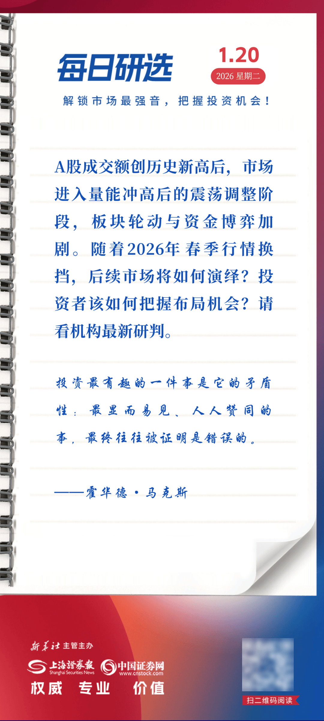 每日研选 2026年1月以来,全A成交额屡创新高,市场局部呈现过热特征。机构普遍认为,"点刹"不是"熄火",随着监管治理水平的提升,市场有望实现更为健康长 远的发展。在无风险收益逐步下沉、资本市场改革持续推进以及中国经济转型的大背景下,由转型新动能驱动的行情仍具备较大的发展空间,看好景气行 业细分龙头。 短期内,1月下旬年报预告密集披露,叠加监管层通过上调融资保证金比例等措施引导市场理性回归,指数上行动能趋于平缓,预计以震荡消化为主。显 著特征是行业主线切换加快,前期热门主题板块降温,资金向具备基本面支撑的领域迁移。在此环境下,建议投资者避免盲目追高,以逢低布局为主,聚 焦业绩确定性机会。 放眼中期,市场核心支撑逻辑持续强化。当前市场处于政策宽松、产业升级与资金共振的行情周期,与历史上"转型驱动行情"启动阶段具备相似性。政策 层面,央行定向降息打开宽松空间,资本市场改革持续深化,引导长期资金入市;资金层面,保险保费"开门红"、居民存款带来增量资金,公募基金发行 回暖;产业层面,AI算力、新能源、有色金属等领域供需格局改善,形成明确景气主线。尽管未来三个月指数涨势可能趋缓,但行情逻辑未被破坏,若 增量资金延续、 ...