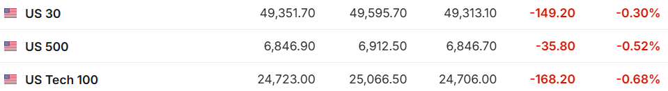 1. 2月5日(周四)美股盘前,美股三大股指期货齐跌。截至发稿,道指期货跌0.30%,标普500指数期货跌0.52%,纳指期货跌0.68%。 | = US 30 | 49,351.70 | 49,595.70 | 49,313.10 | -149.20 | -0.30% | | --- | --- | --- | --- | --- | --- | | ■ US 500 | 6,846.90 | 6,912.50 | 6,846.70 | -35.80 | -0.52% | | ■ US Tech 100 | 24,723.00 | 25,066.50 | 24,706.00 | -168.20 | -0.68% | 2. 截至发稿,德国DAX指数跌0.63%,英国富时100指数跌0.40%,法国CAC40指数跌0.06%,欧洲斯托克50指数跌0.41%。 | 德国DAX30 I | 24,497.83 | 24,672.33 | 24,434.99 | -154.94 | -0.63% | | --- | --- | --- | --- | --- | --- | | 端 英国富时100 | 10,361. ...